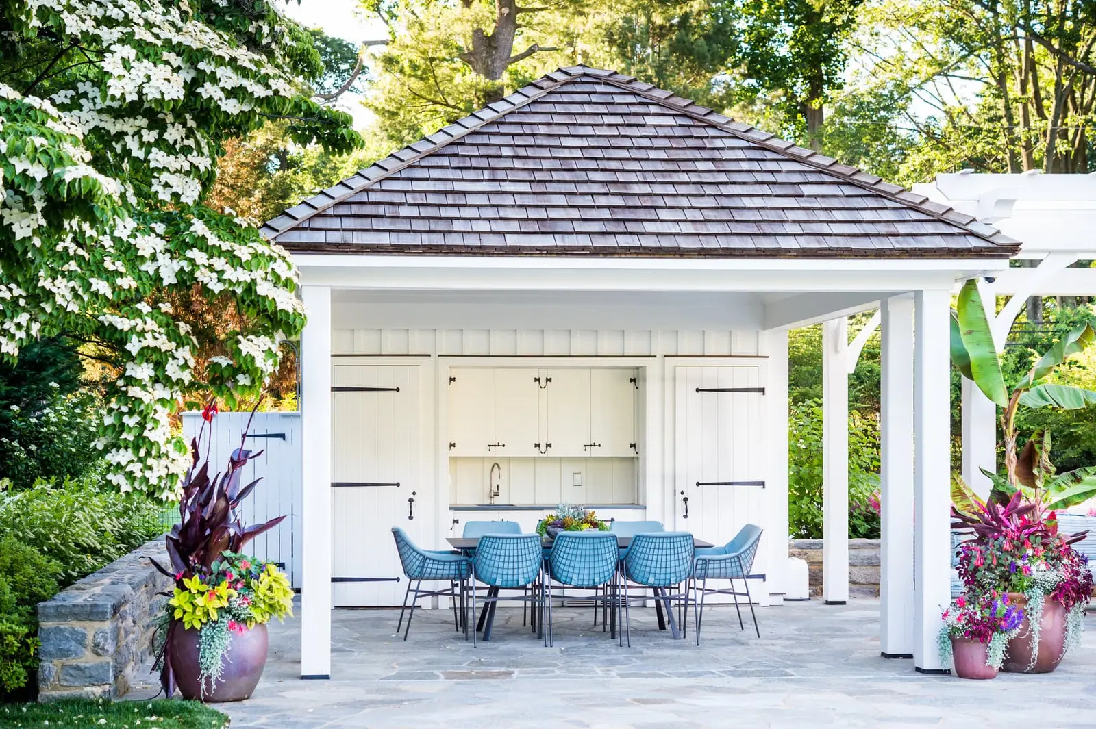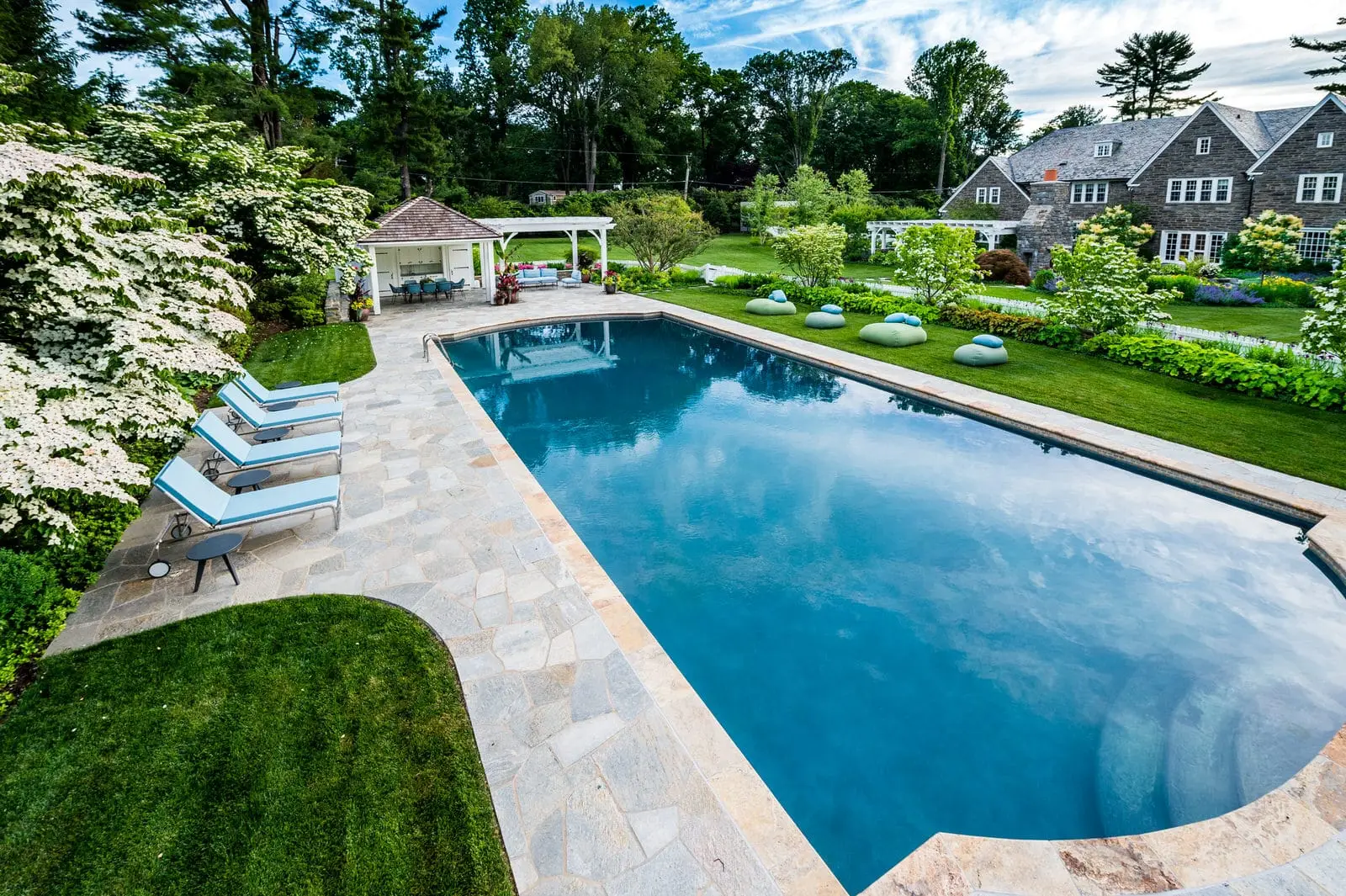 Innovative furniture surrounds the seating areas near the house, beside the renovated swimming pool, and the new pool house. Emphasizing herbaceous species diversity, the planting forms a texturally rich backdrop for the outdoor rooms, offering distinct foliage patterns and sequential bloom periods.