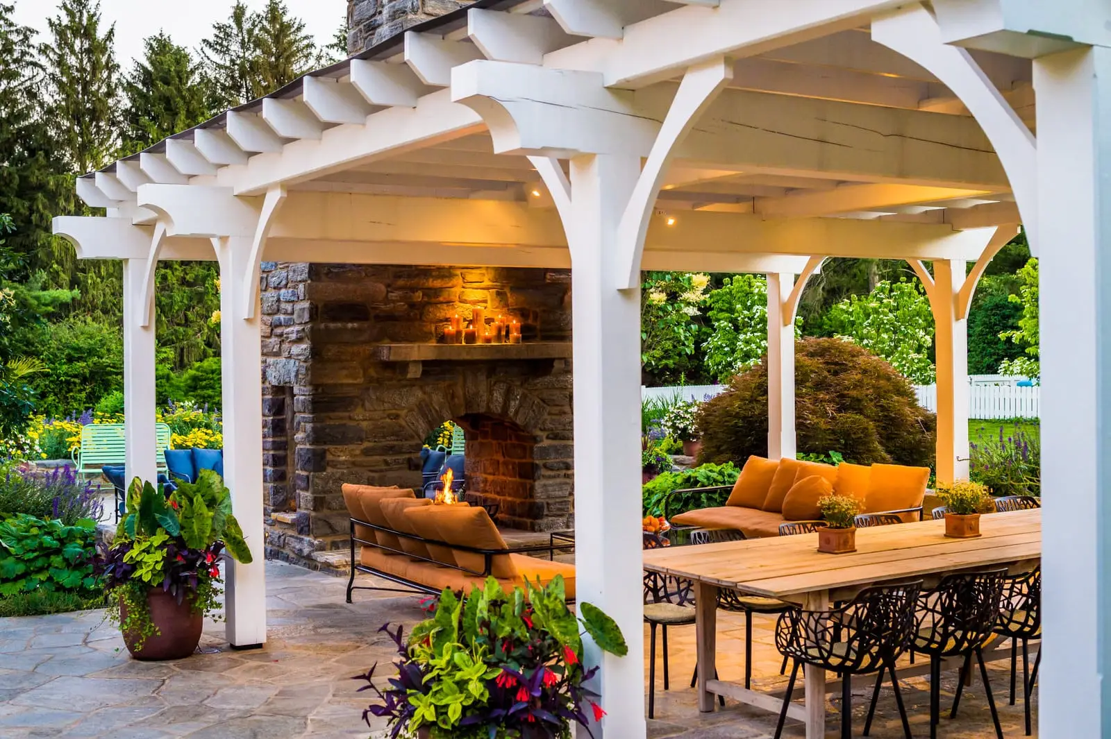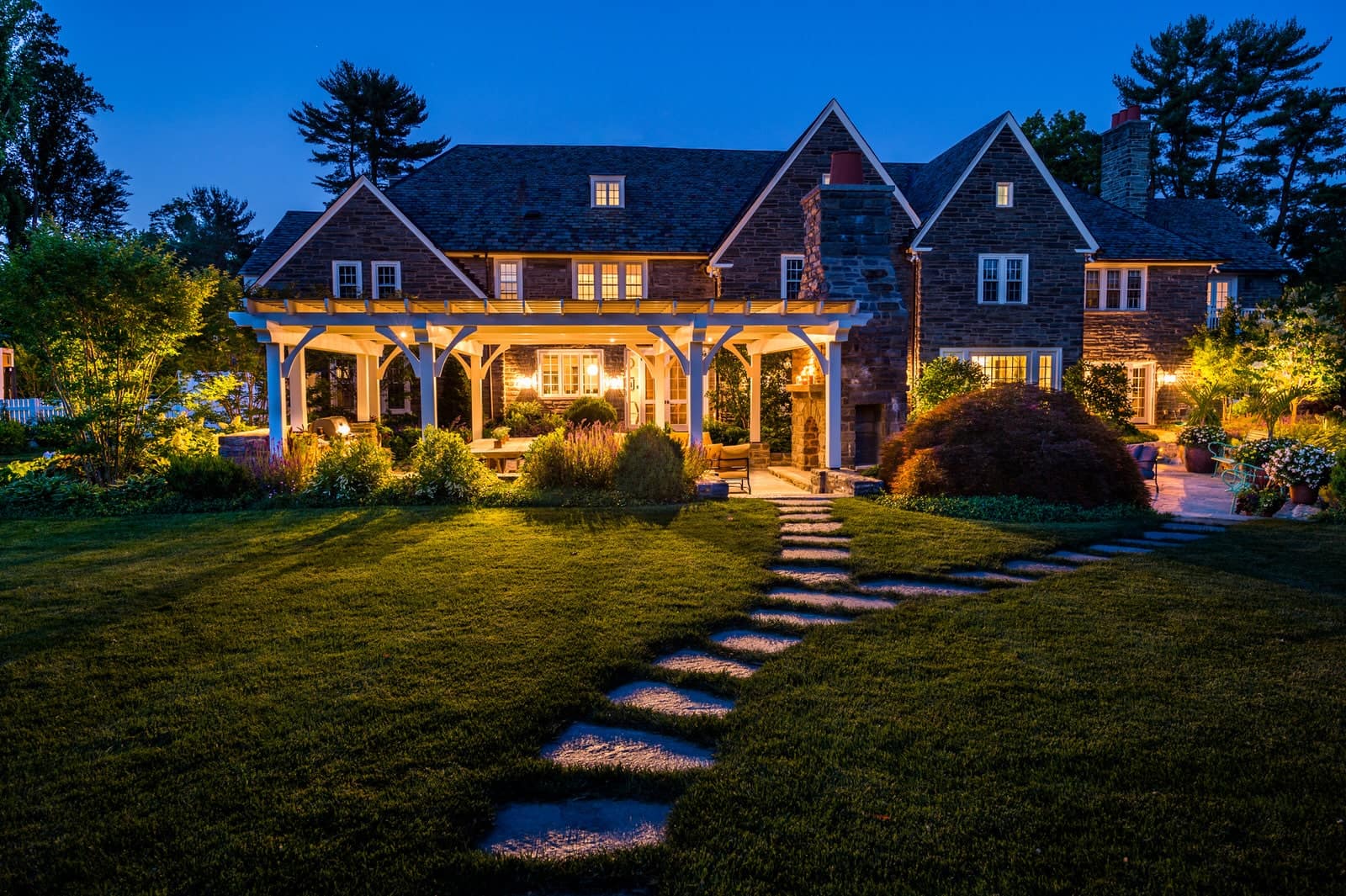 The mica schist stone used on the house was brought into the landscape via irregular paving, low seating walls, and a two-sided outdoor fireplace. Shade panels control the opacity of the new pergola over the main outdoor kitchen and dining space.